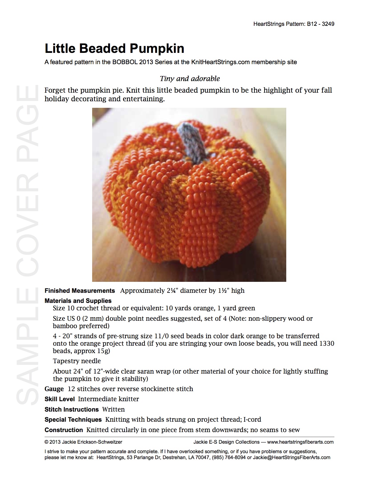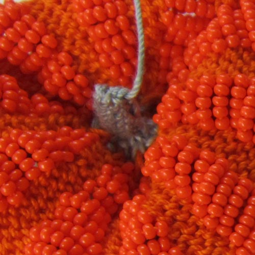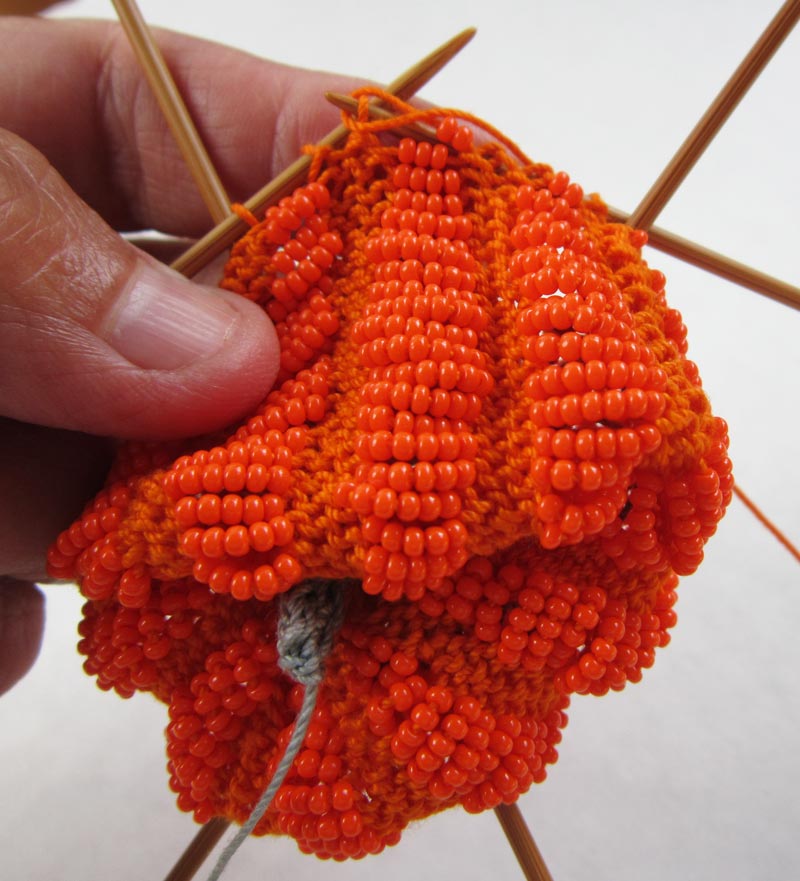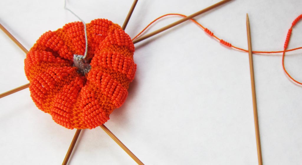 The additional challenge with Little Beaded Pumpkin and other similar Structural Beaded Knitting projects where the beads are actually creating the form, is to accurately count the number of beads being slid between stitches. A good practice is to Be a Bead Counter with the motto “count twice knit once”: