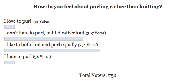 Of the 751 who voted (only about 20% of our members), 36 said “I hate to purl”. Interestingly, it was almost a tie-break with the number who said “I love to purl” (34).
