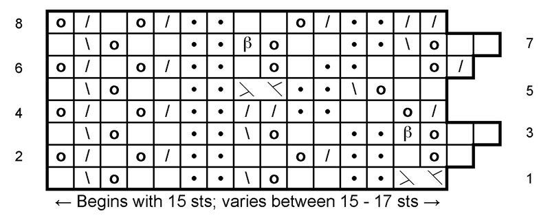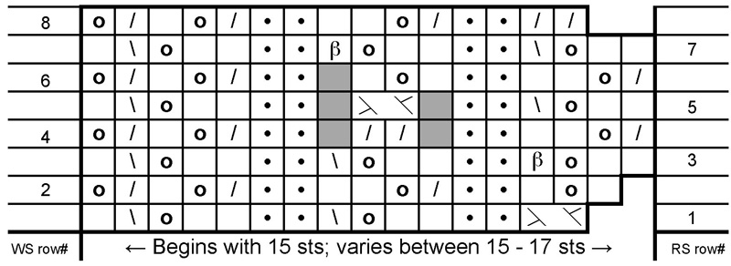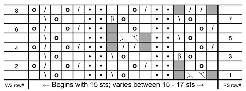 You’ll notice that this is the first chart we’ve encountered where the shaped edge shows bound off stitches (the previous month’s edge was shaped with interior decreases). In the ornament pattern, there are specific instructions for doing a k2tog bindoff. If you prefer to use another bind off, this chart shows exactly where you’d substitute your own.