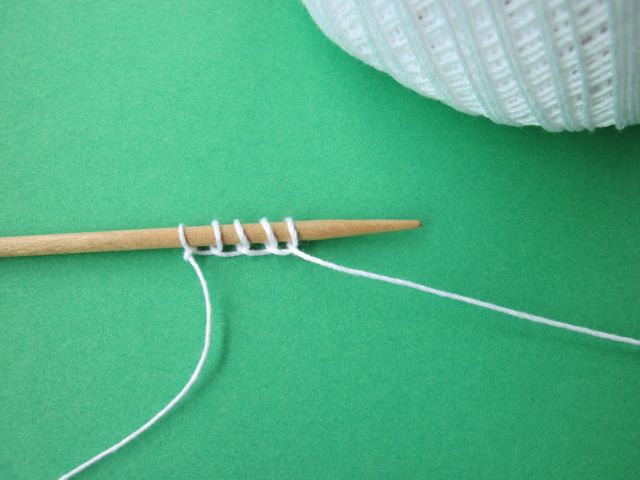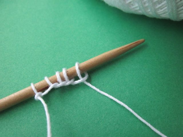 working end of simple half-hitch cast on is coming to the FRONT as the work faces you to begin knitting first row